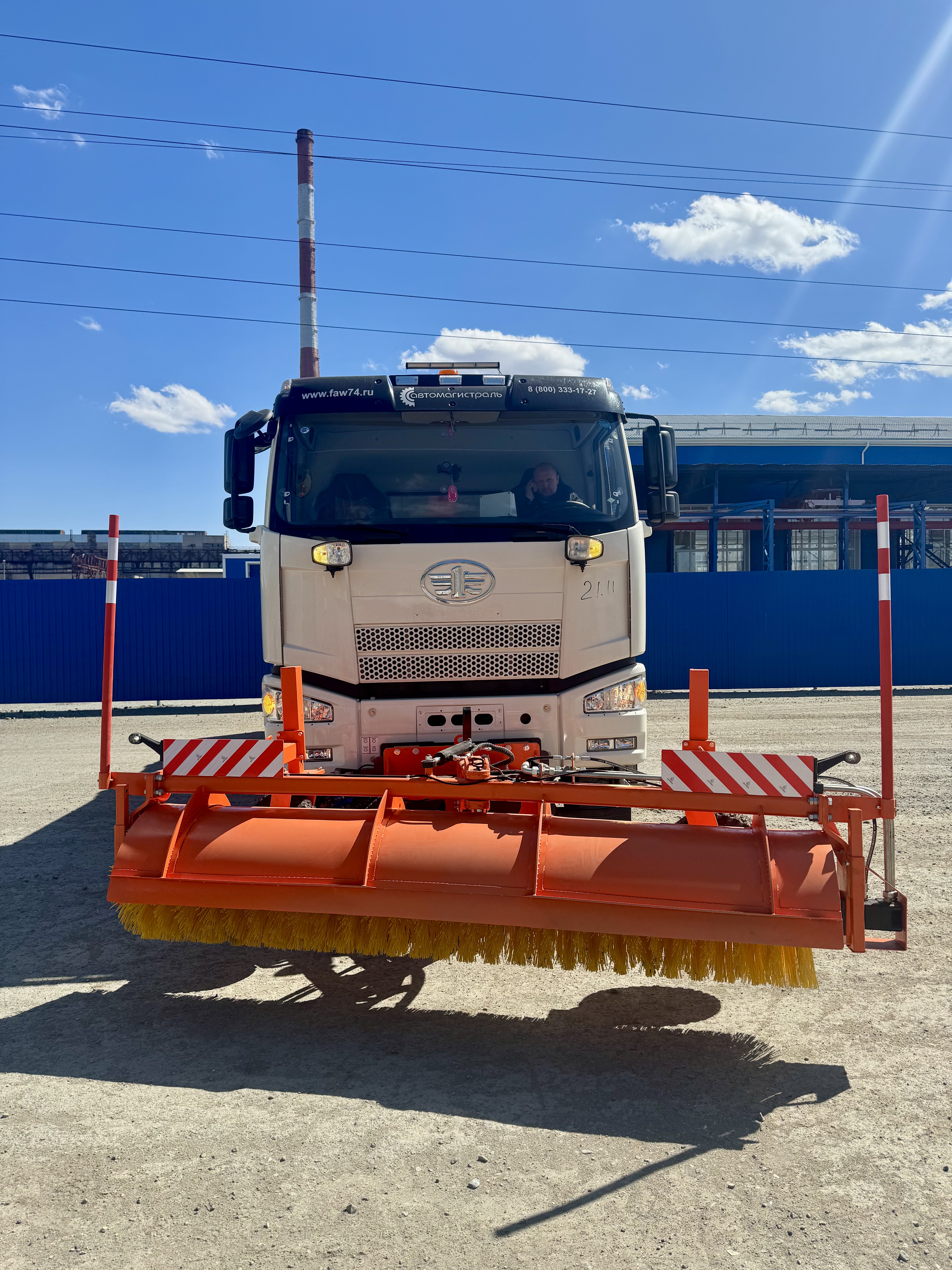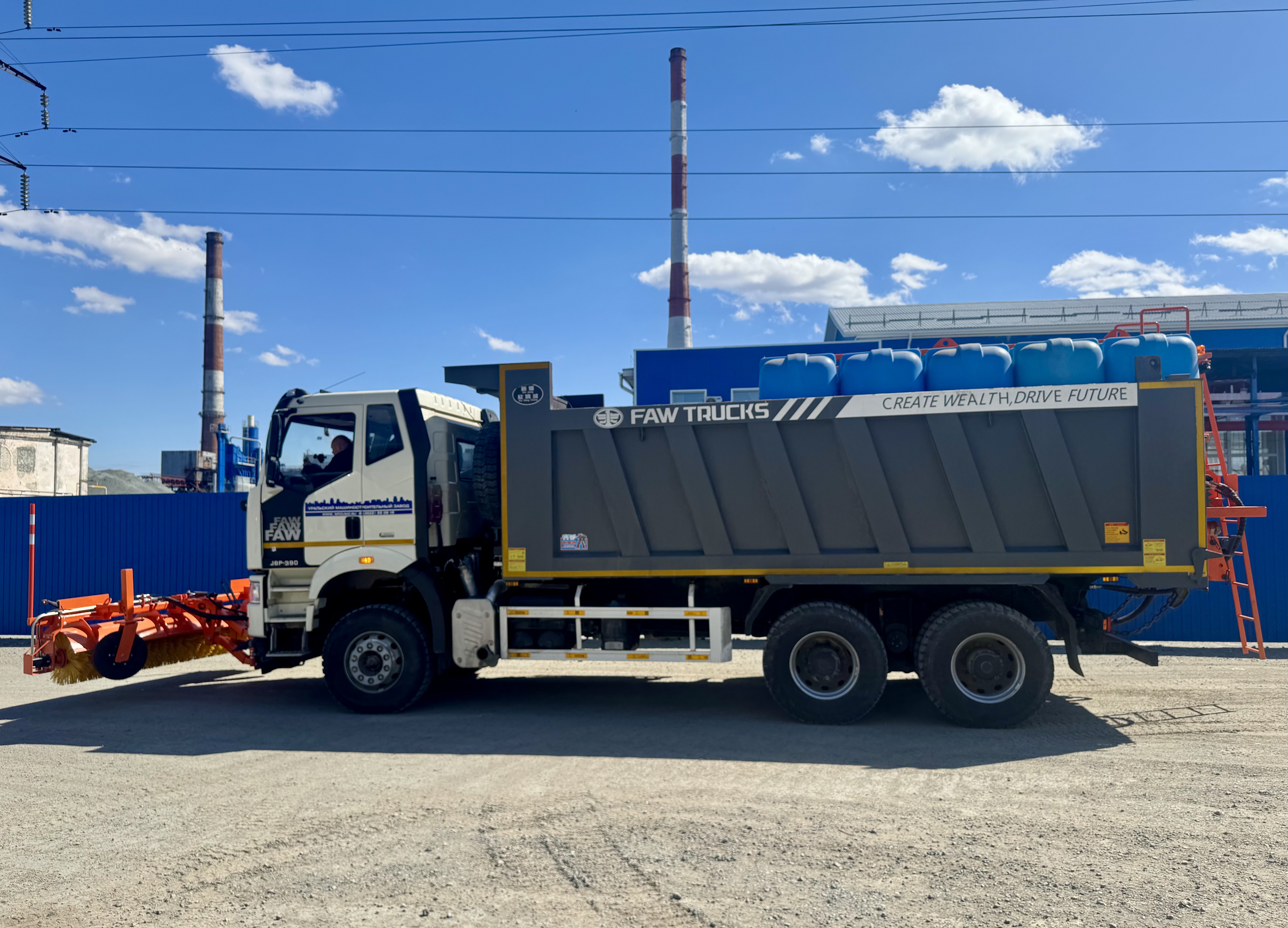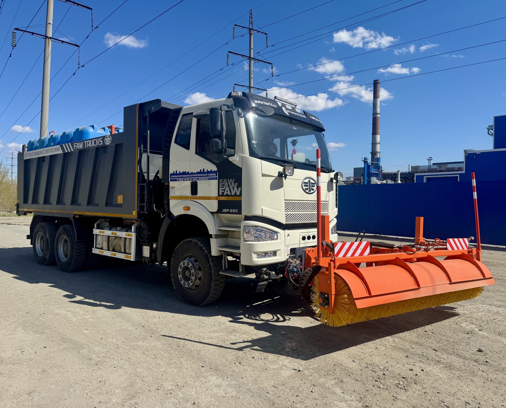 Поливомоечная машина на шасси FAW оборудована пластиковыми баками общим объёмом 10 м3, что гарантирует значительный запас воды и высокую стойкость к коррозии. При выполнении мойки ширина обрабатываемой полосы составляет до 10 метров, а при поливе — до 20 метров. Передняя поворотная щетка позволяет эффективно очищать не только полосу непосредственно перед машиной, но и прилегающие зоны, включая бордюры и обочины.